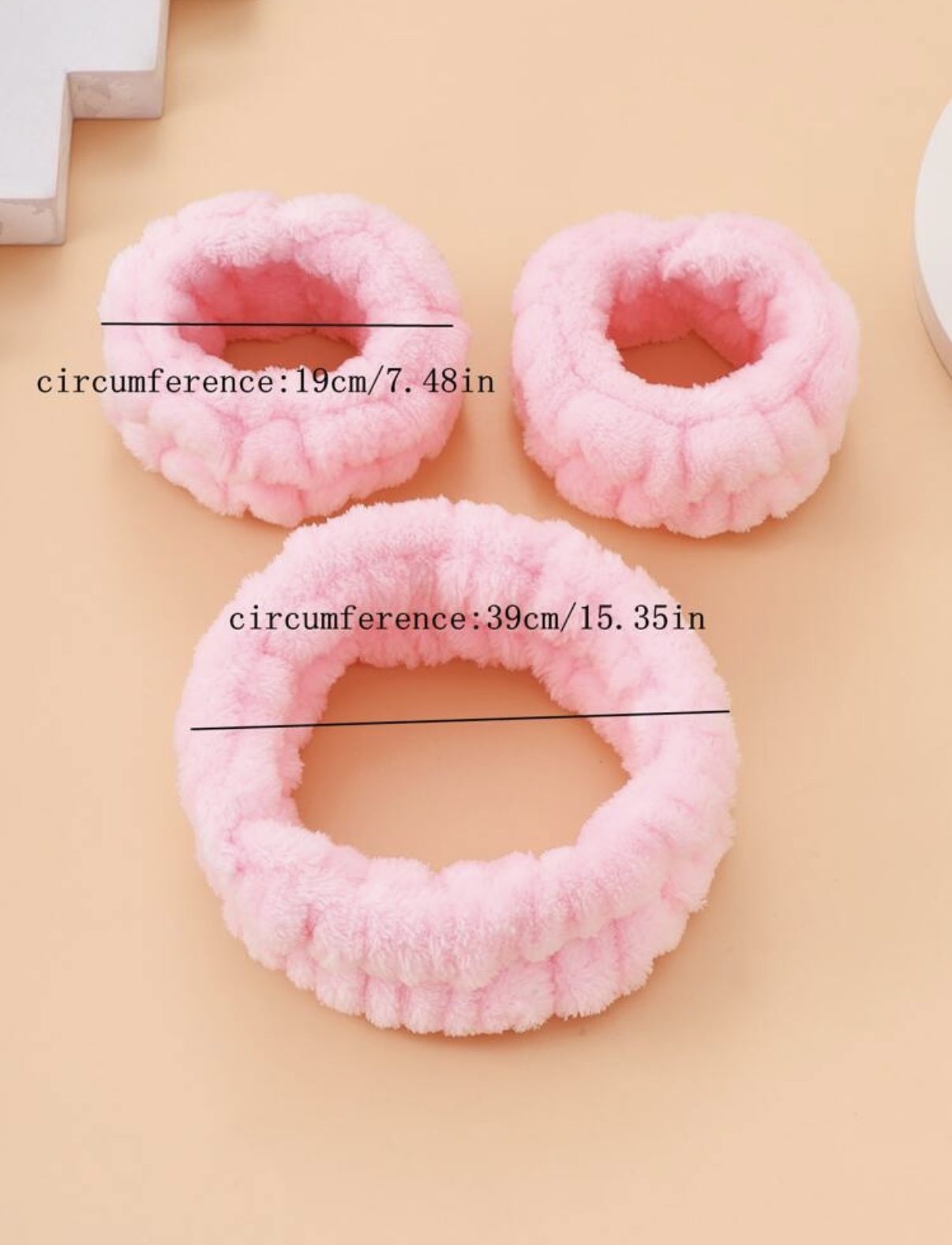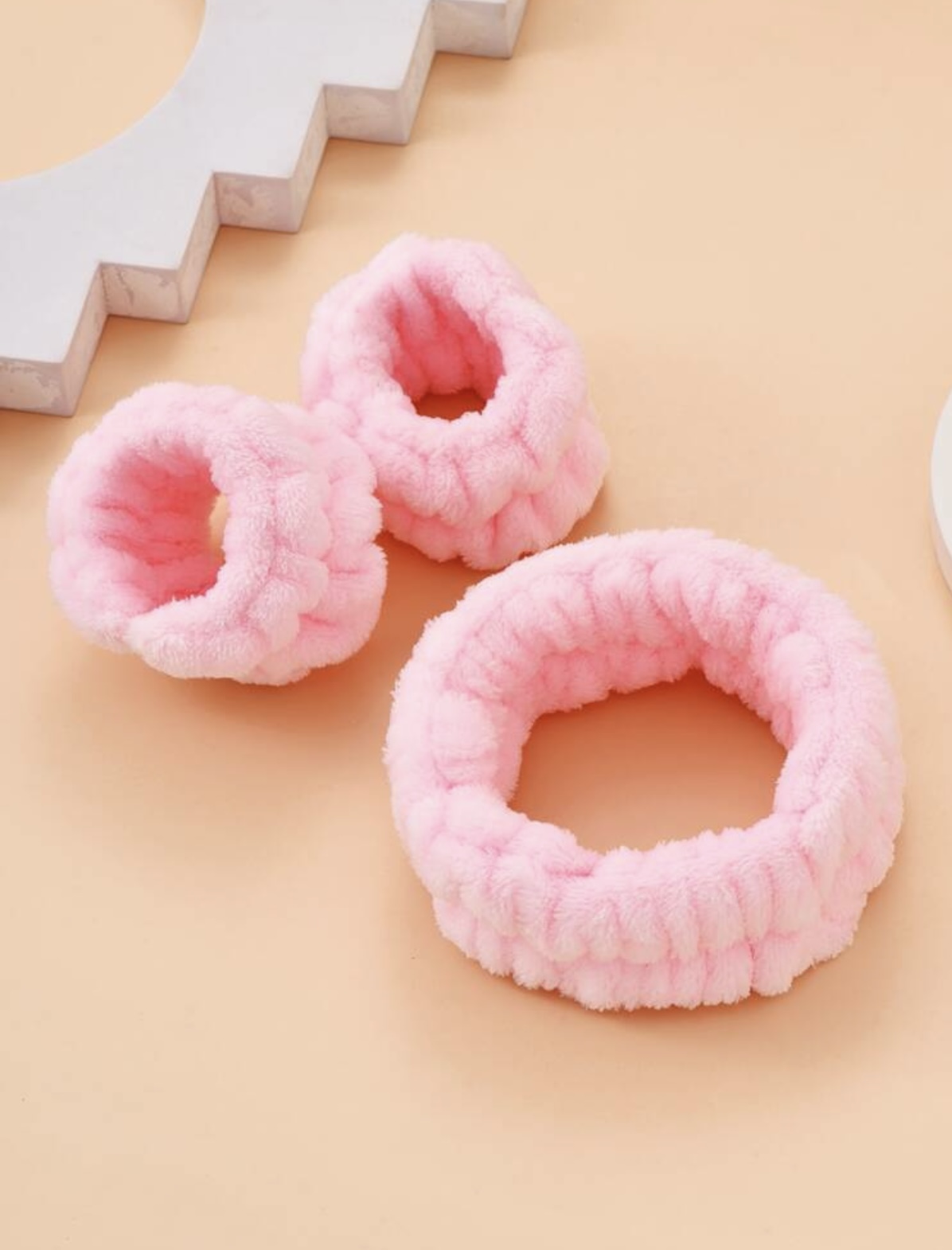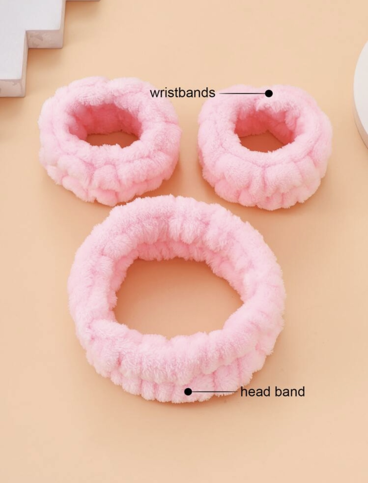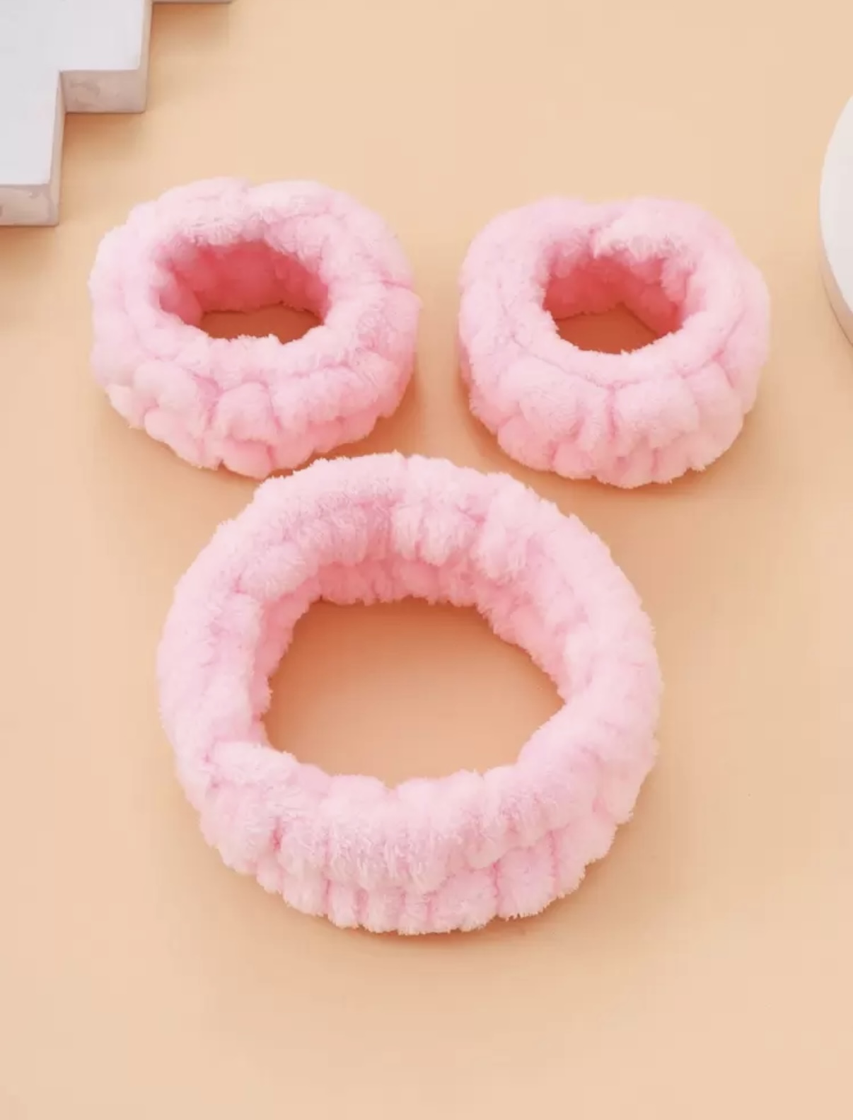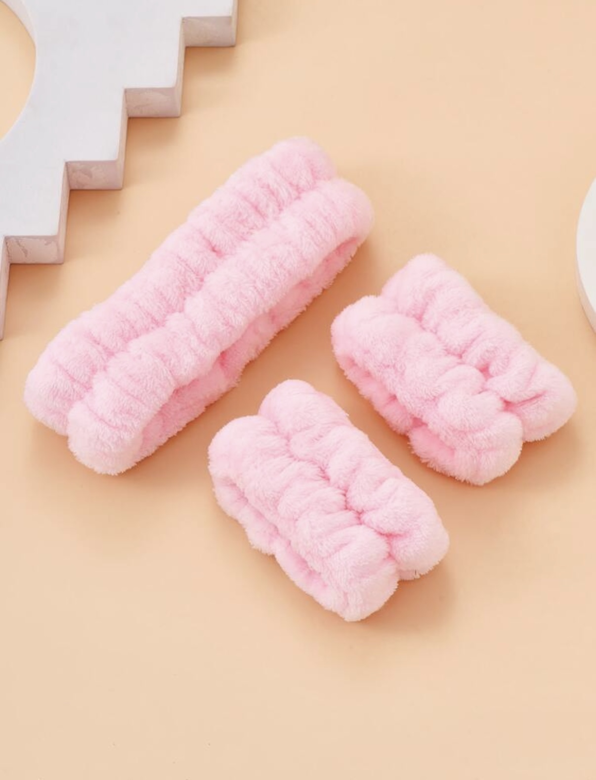 Juego de 1 diadema de baño y 2 pulseras de color rosa, perfectas para usar diariamente en tu rutina de skin care